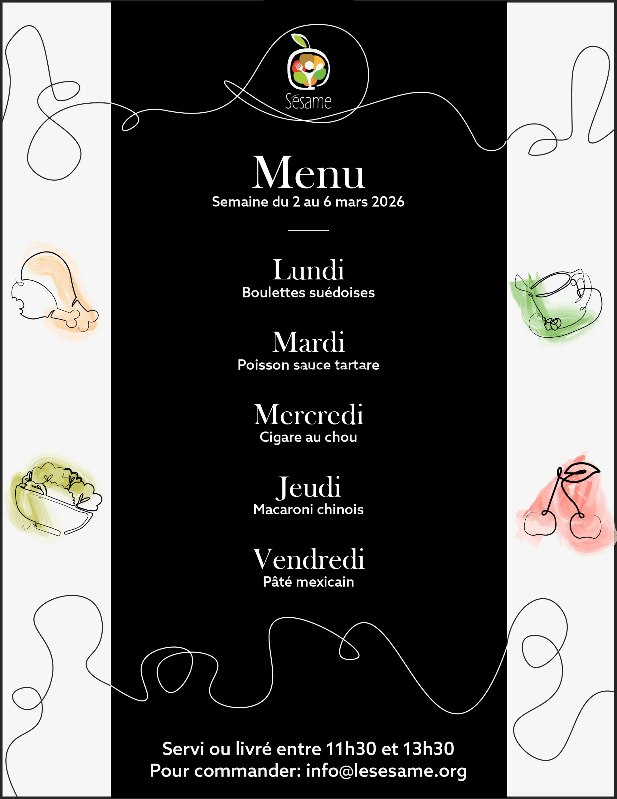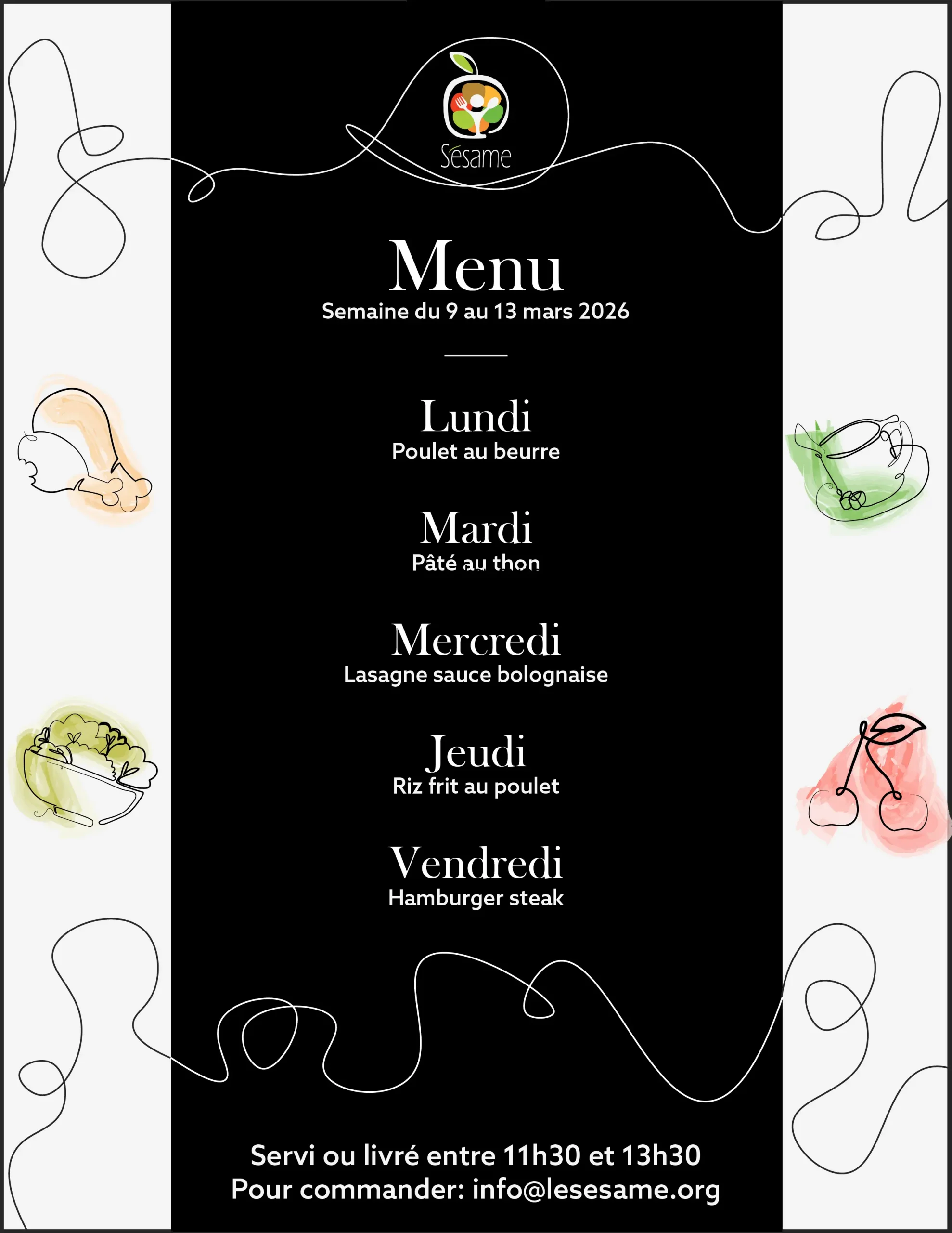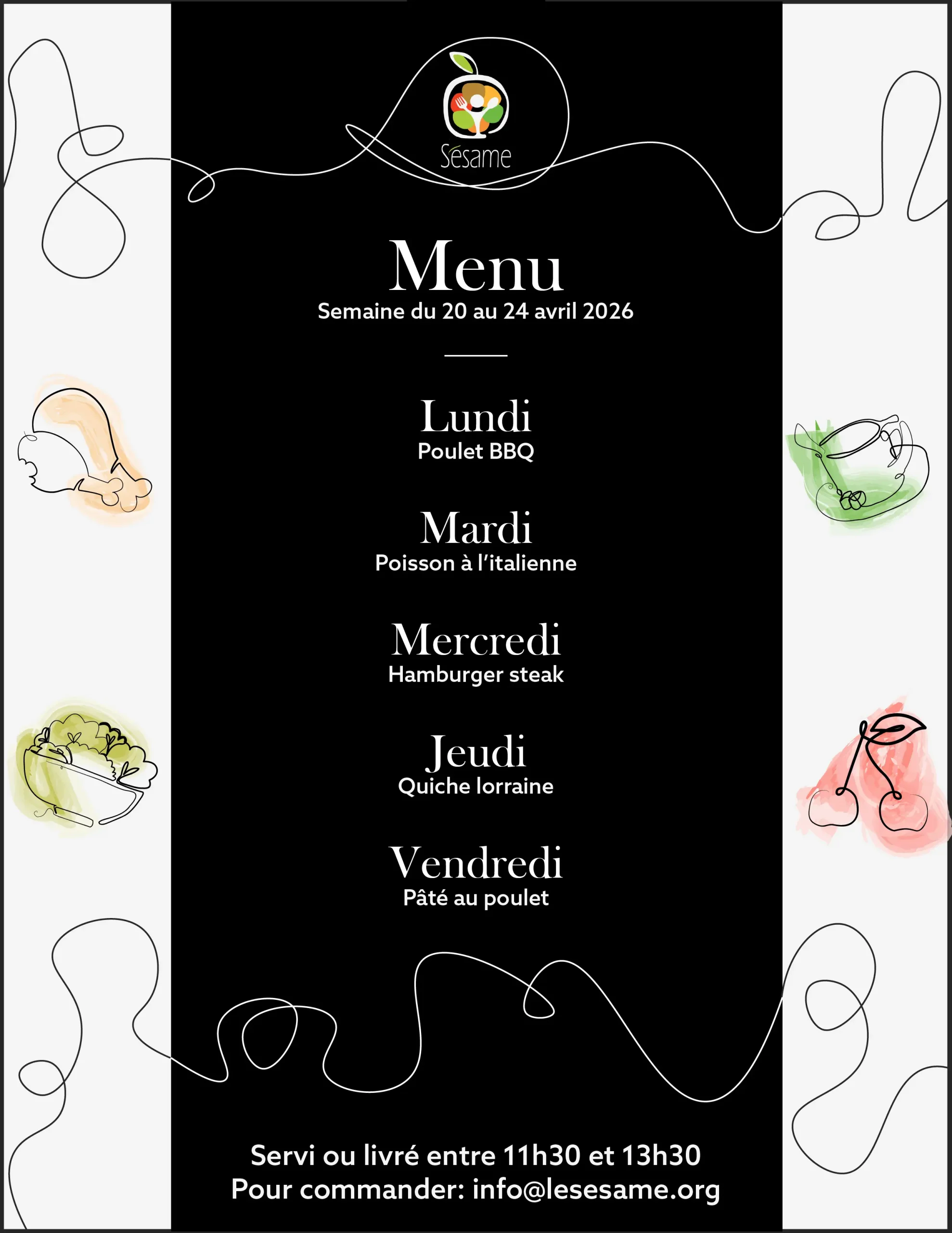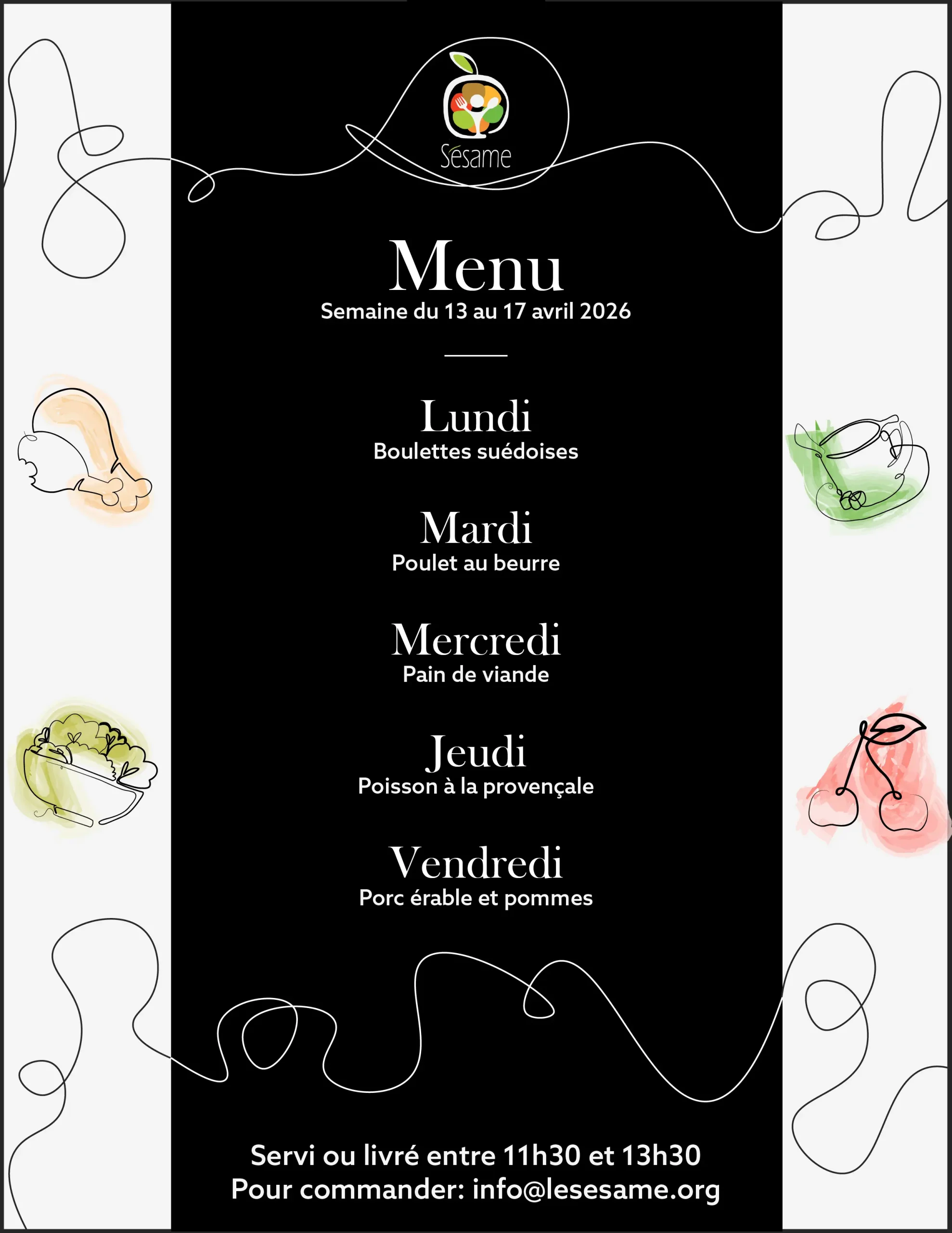 Livré chez vous du lundi au vendredi entre 11h et 13h30 pour aussi peu que 10$ par jour (toutes taxes et livraison incluses).